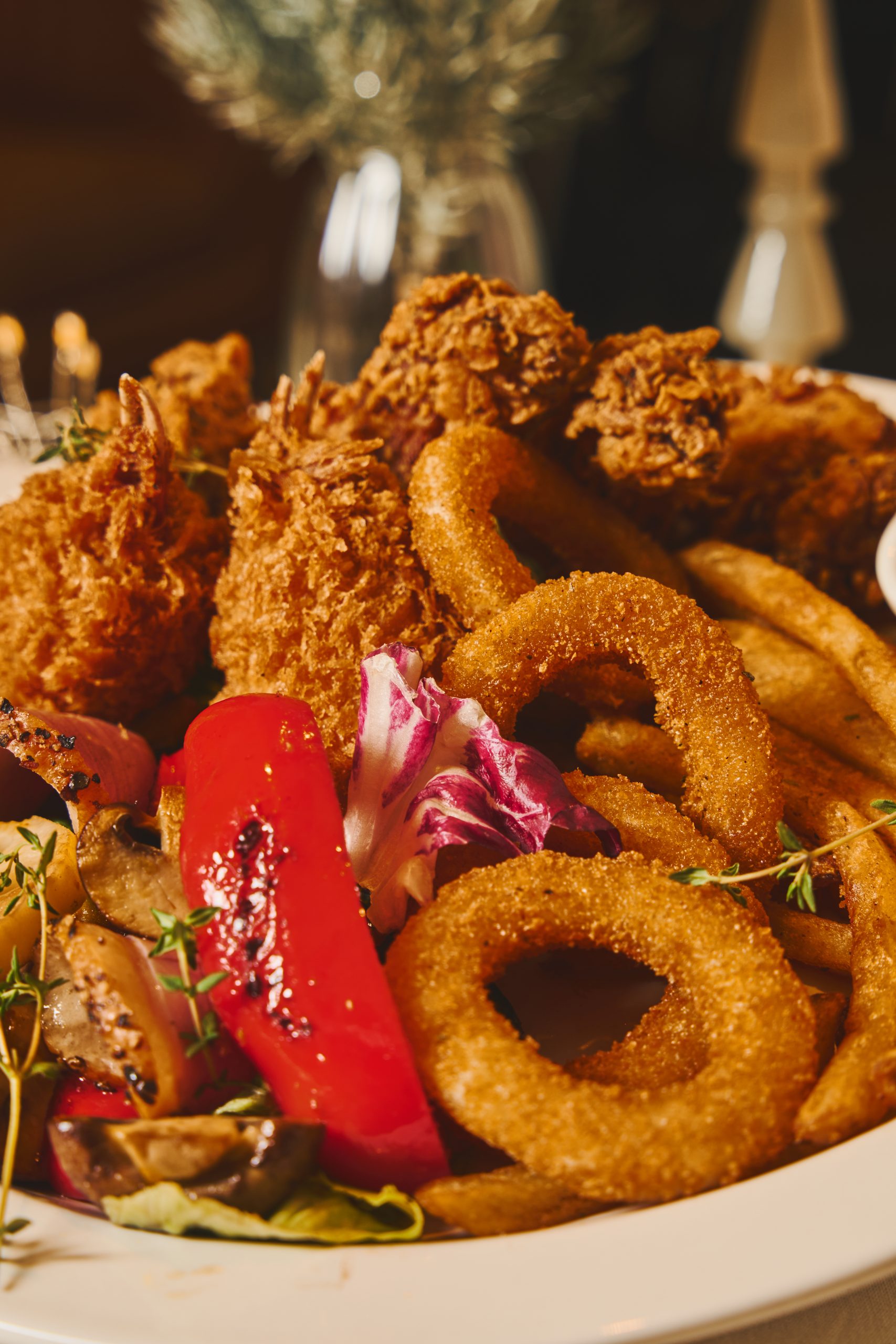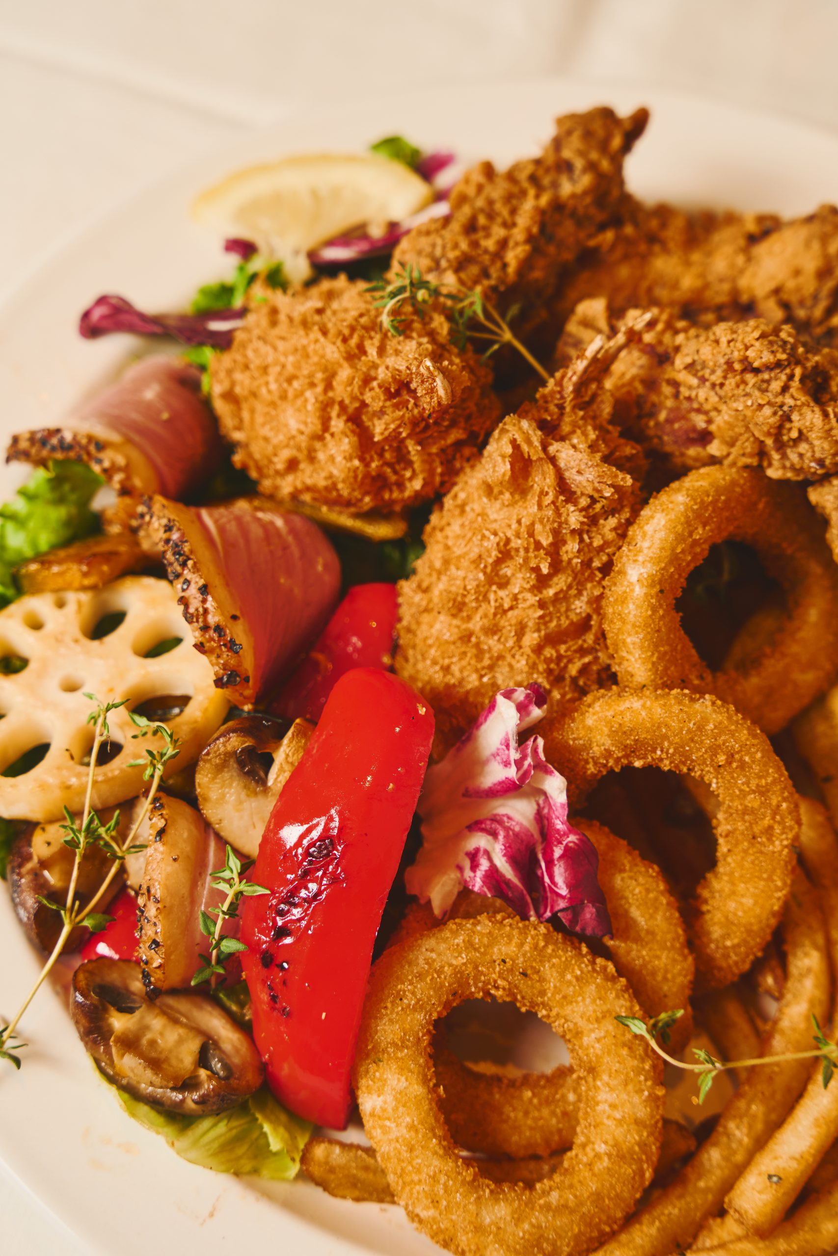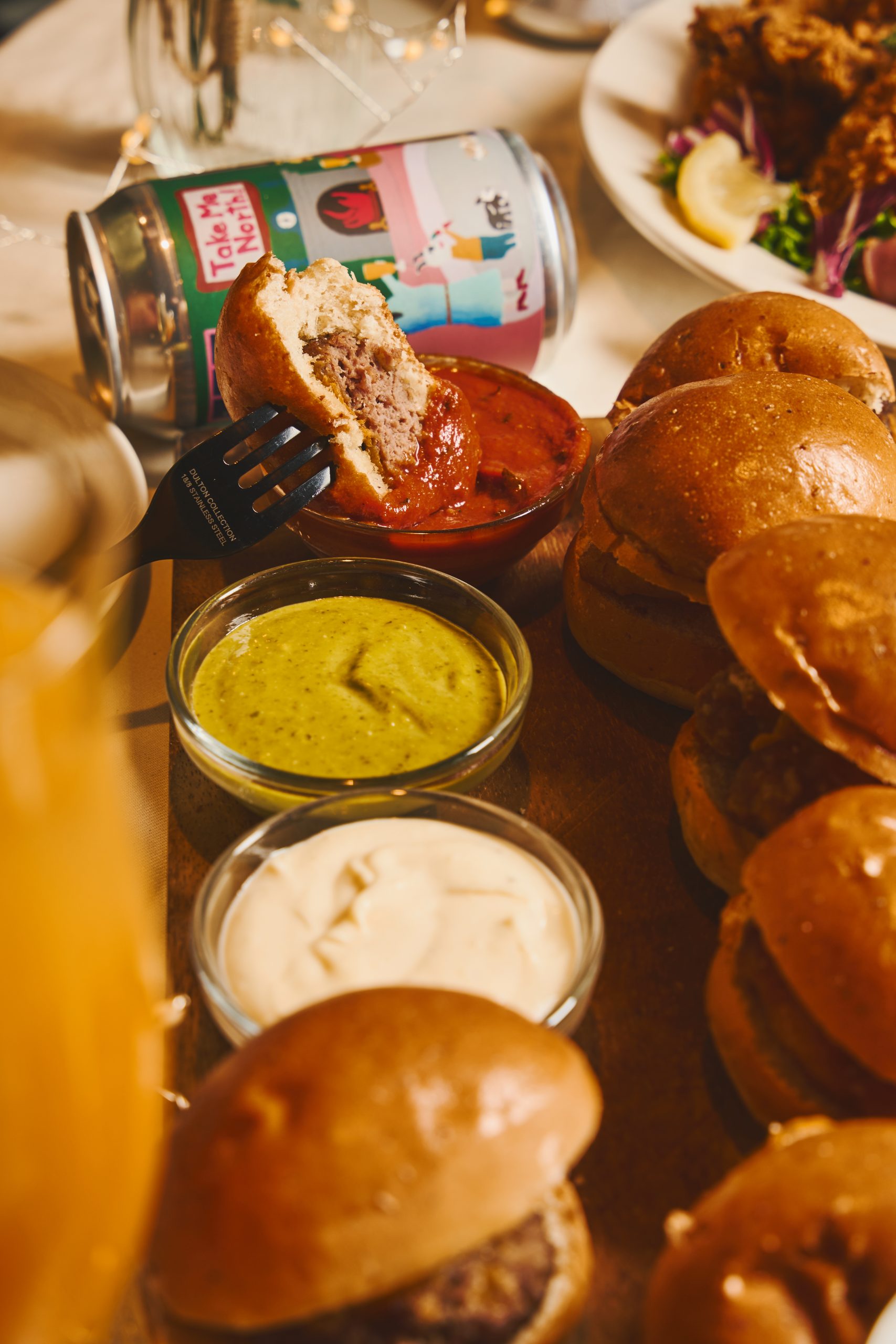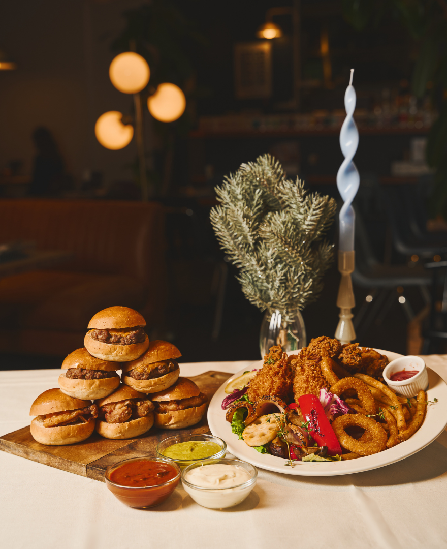 サイドに欠かせないのはボリュームたっぷりオードブル。お店でも大人気のフレンチフライ&オニオンリングに、自家製フライドチキン、そしてちょっぴり豪華に、爪つきカニクリームコロッケが!さらにはお口直しにさっぱりとした鴨のパストラミに、グリルした冬野菜でちゃんと栄養素も。スライダーBOXのソースにディップして味変もできちゃいます。/クリスマスオードブルBOX ¥2,800 (tax in)