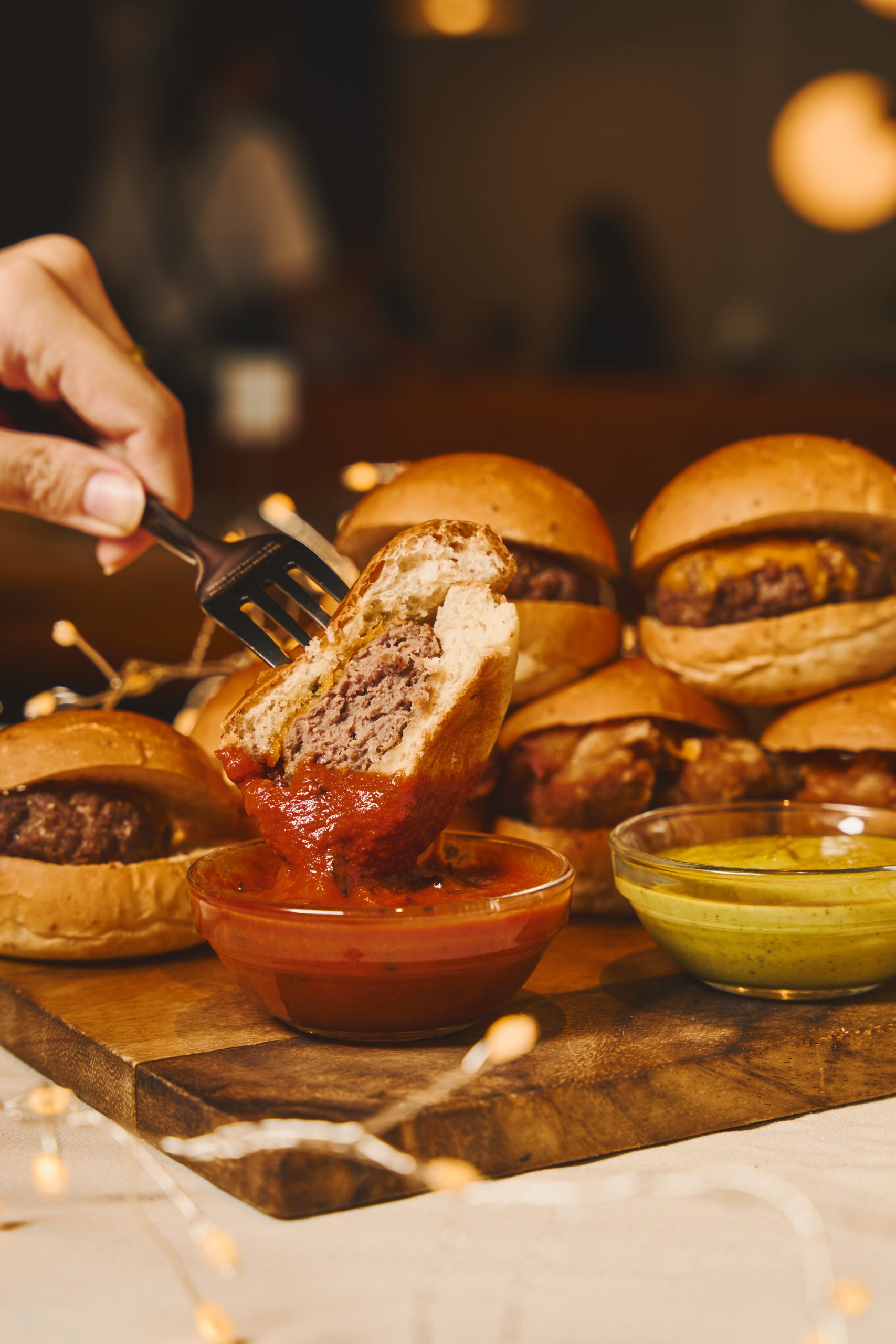 今年はスライダーバーガーが6個にボリュームアップ。ビーフ3・チキン3にチーズつきでこれだけでも楽しめる味に。さらにクリスマスカラーをイメージした3種のディップソースつき!(カレー・バジル・チーズ)スライダーはもちろん、オードブルBOXのフレンチフライやオニオンリングにつけても楽しめるオリジナルソース。テーブルの真ん中に置くだけで、部屋がちょっと楽しくなるかも。/クリスマスディップスライダーBOX ¥3,500 (tax in)