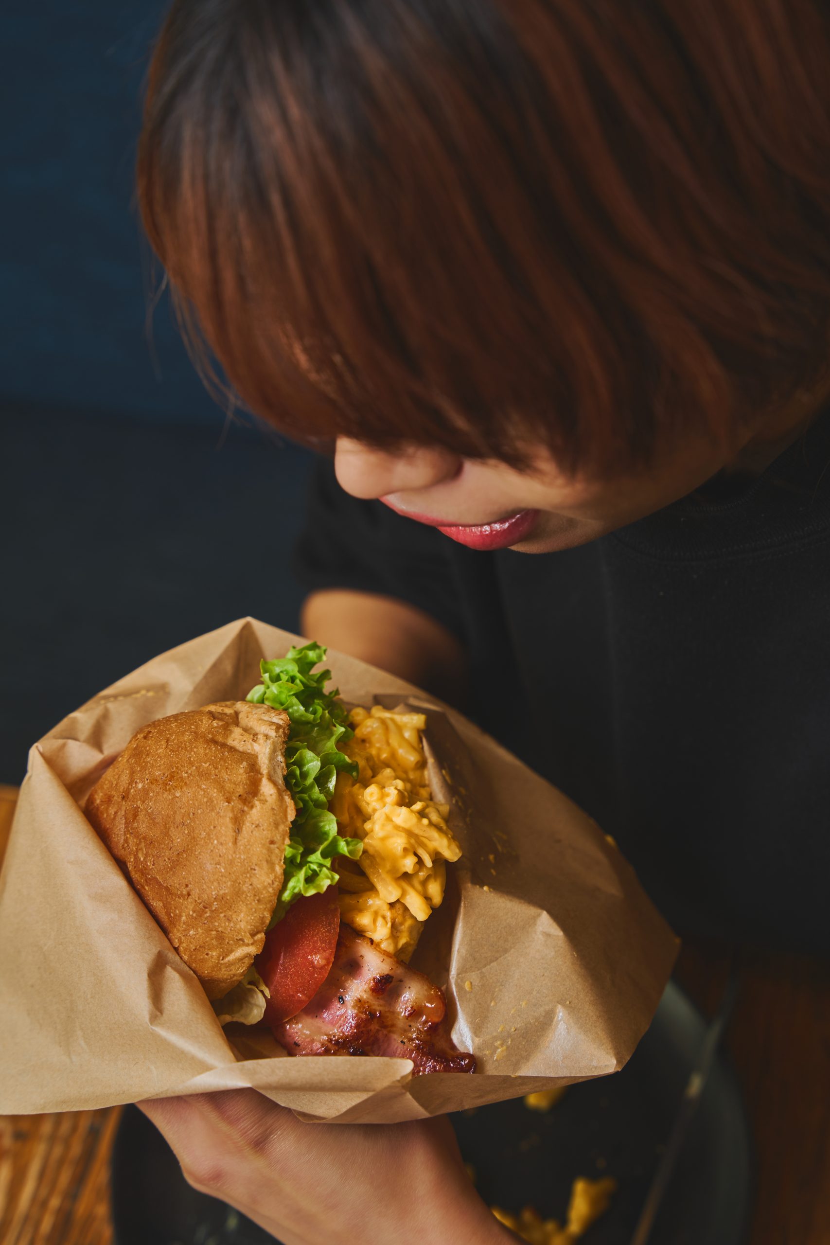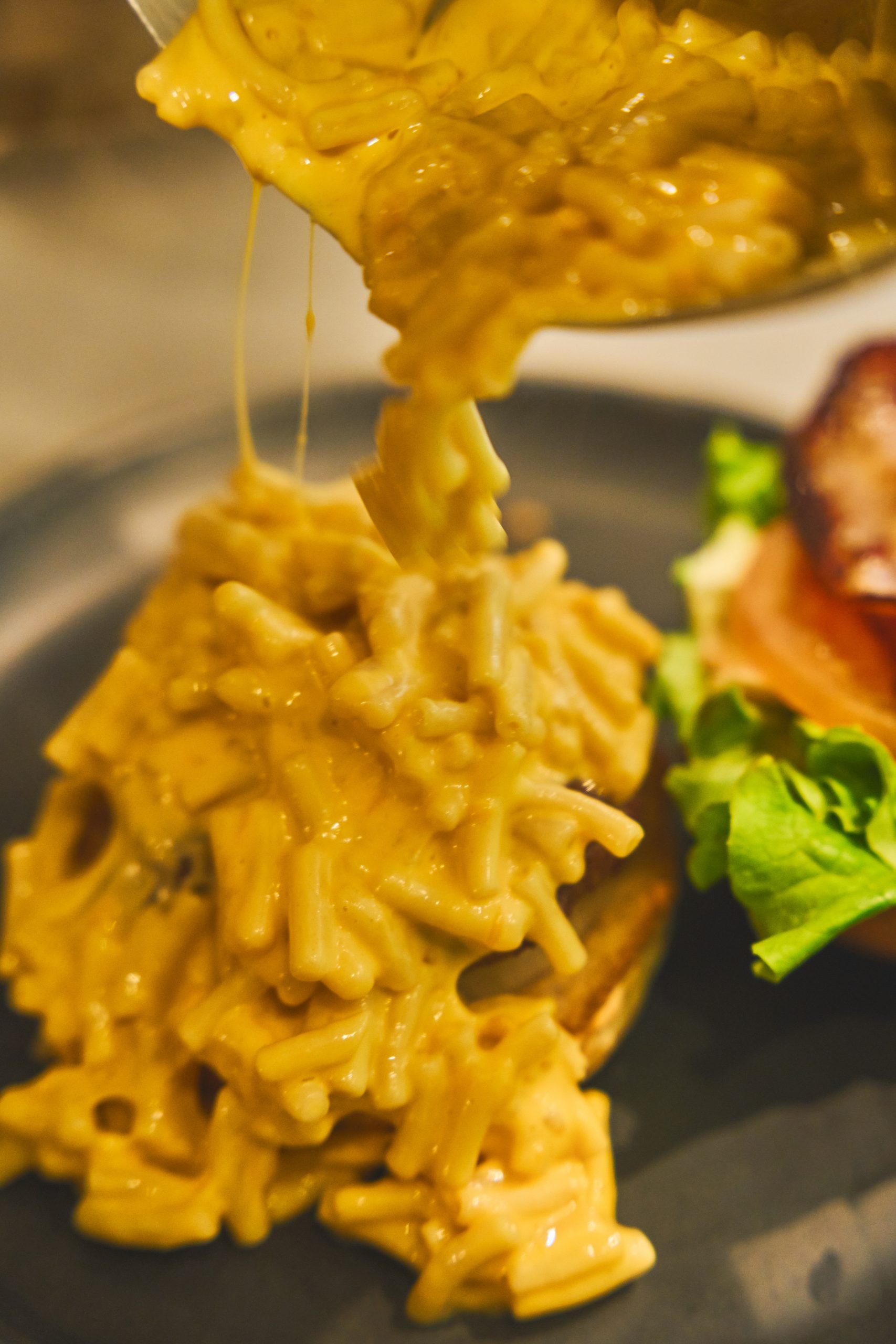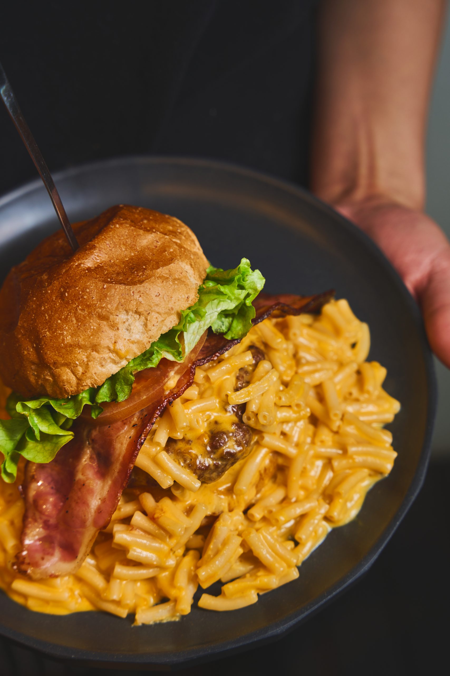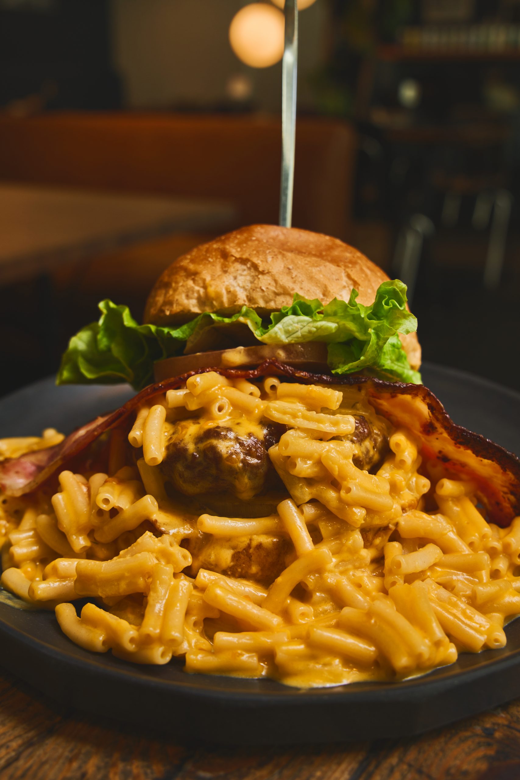 肉汁溢れるパティにマカロニチーズ。それだけで充分なのに、はみ出すほどの大きなベーコンも追加しちゃいました。このカリッとしたベーコンがまた違った食感をプラス。マカロニチーズとご一緒に召し上がれ!