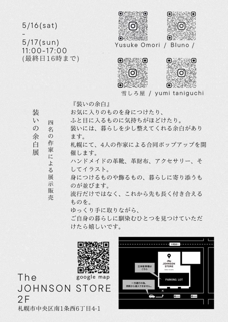 お気に入りのものを身につけたり、 ふと目に入るものに気持ちがほどけたり。 装いには、暮らしを少し整えてくれる余白があります。 札幌にて、4人の作家による合同ポップアップを開催します。 ハンドメイドの革靴、革財布、アクセサリー、そしてイラスト。 身につけるものや飾るもの、暮らしに寄り添うものが並びます。 流行だけではなく、これから先も長く付き合えるものを。 ゆっくり手に取りながら、 ご自身の暮らしに馴染むひとつを見つけていただけたら嬉しいです。