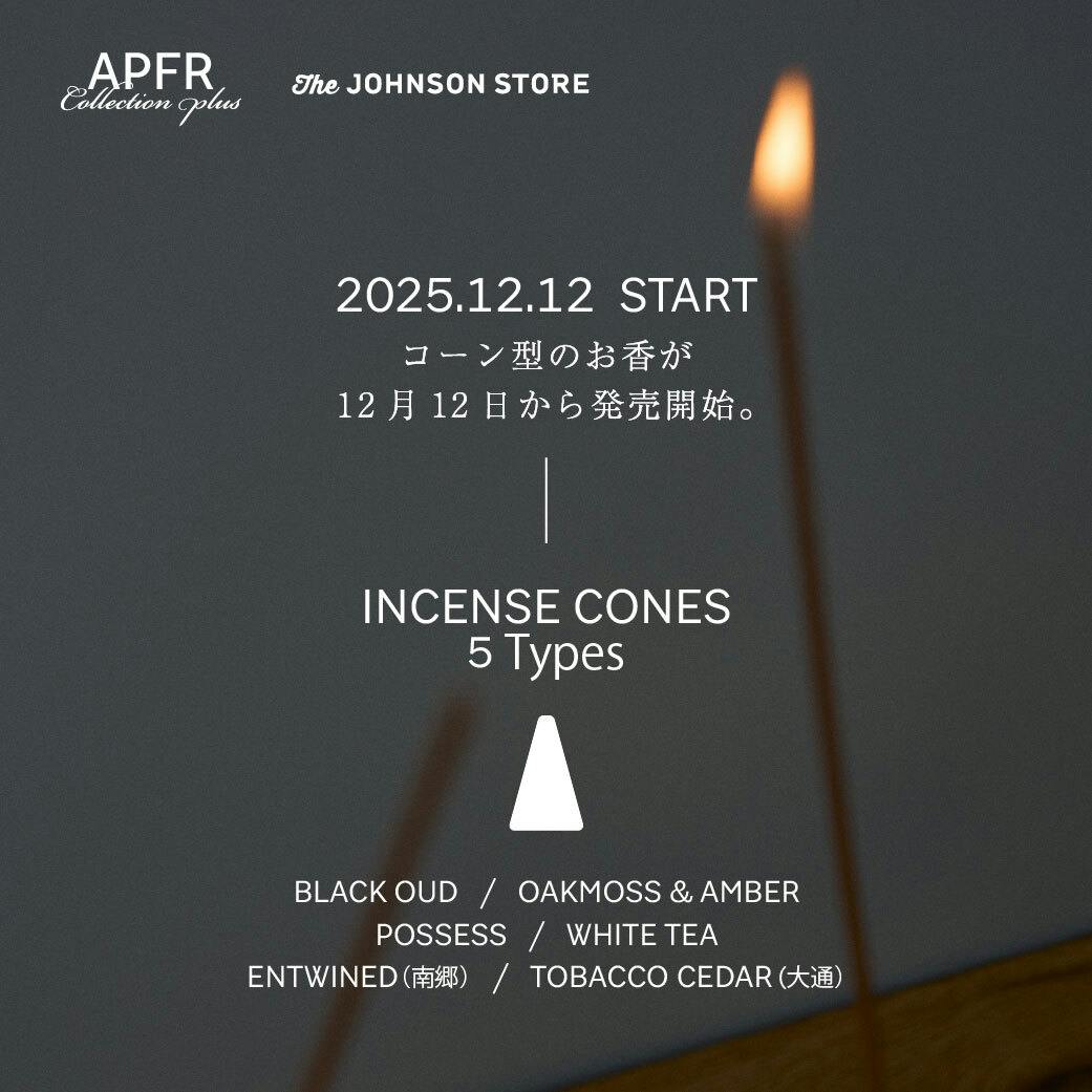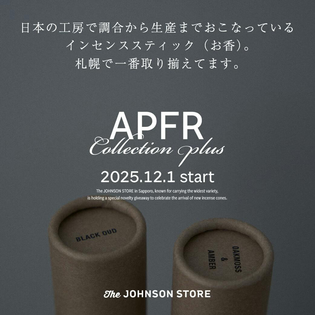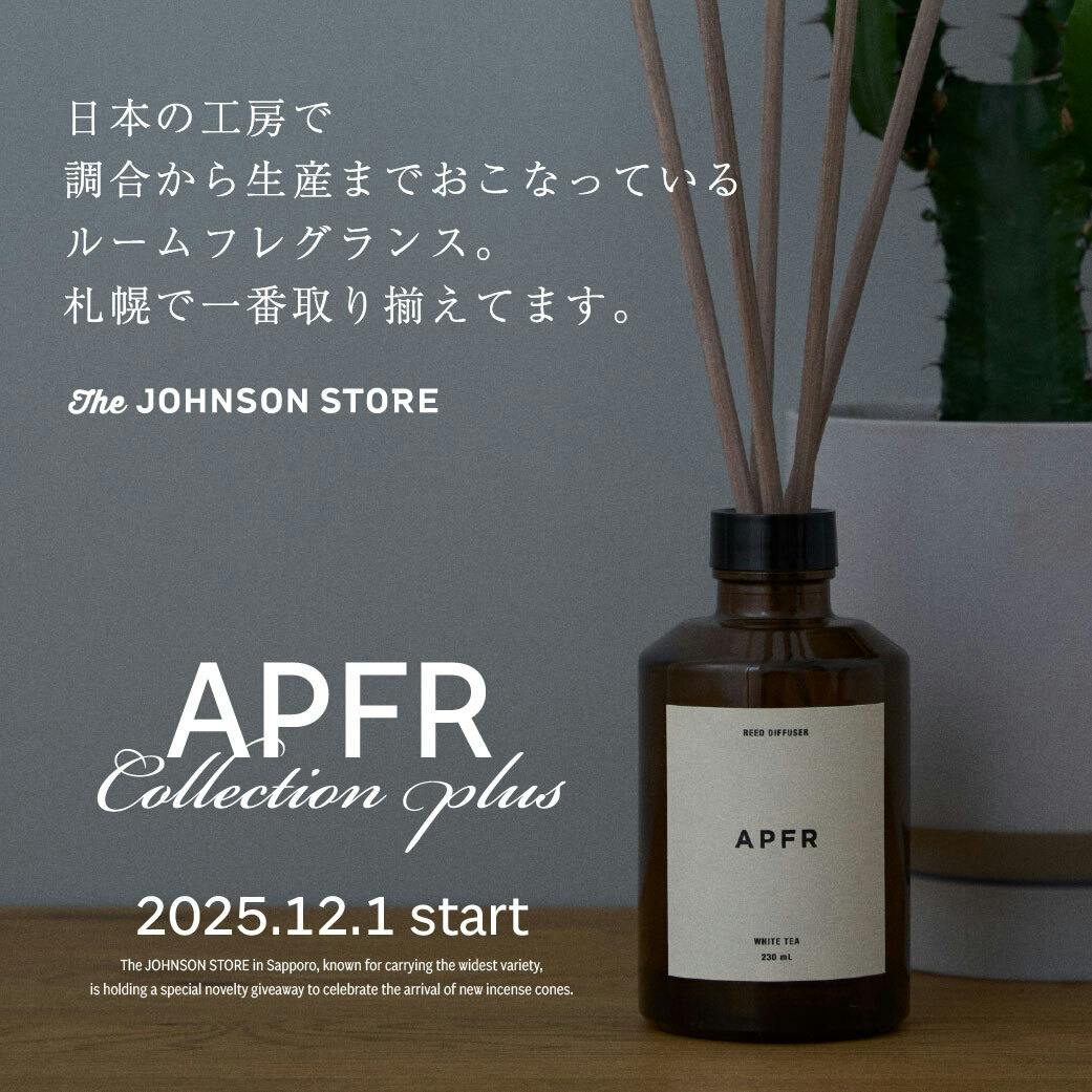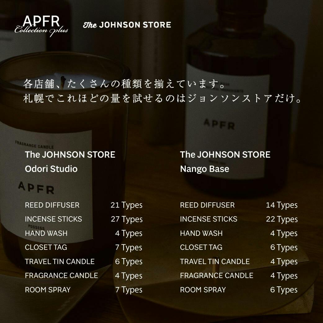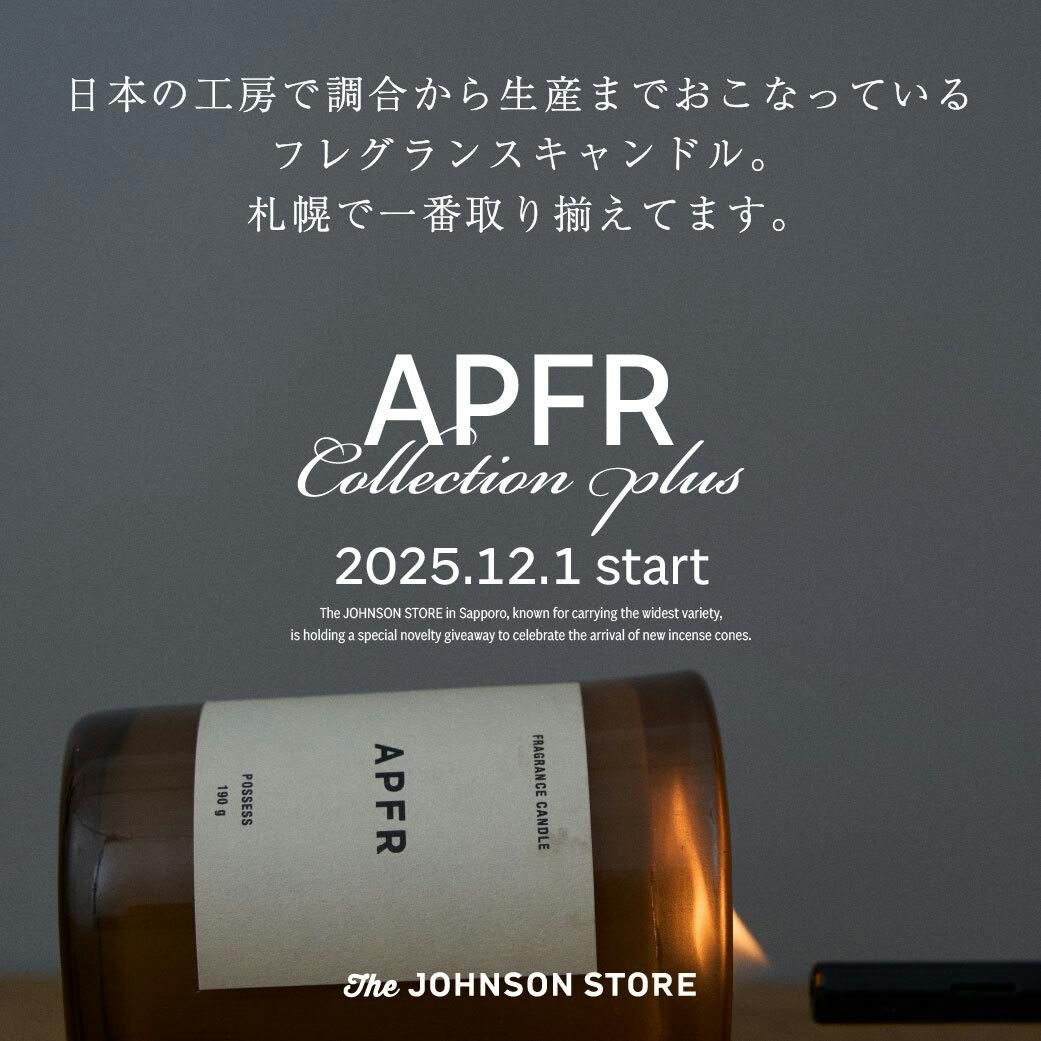 ジョンソンストアで季節を問わず大人気のフレグランスブランド、『APFR』。2011年に設立され、千葉県に工場を構えるハンドメイドのフレグランスブランド。そんなAPFRを、12月1日より通常よりラインナップを増やし展開します。手で注いだキャンドル、 部屋の隅でふわっと漂うインセンス、 棚に置きっぱなしにしたくなるボトルデザイン。APFRは、そんな日常のムードをあげてくれる道具をつくっています。